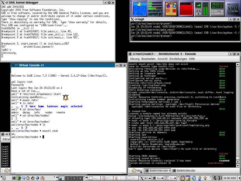HowTo install/configure/run um-openMosix Introduction What is UML ? What is openMosix ? get the um-openMosix patch patching the kernel creating a root_fs booting the system debugging with gdb compiling with ccache screenshot known bugs thanks |